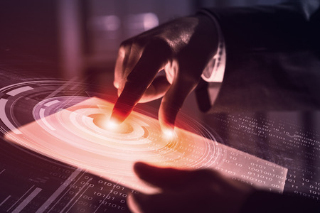 45034185 - businessman pressing modern technology panel with finger print reader