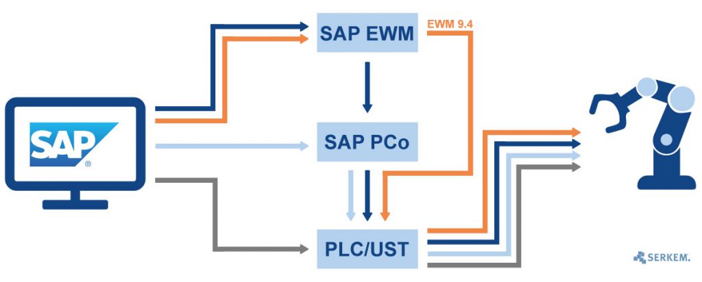 Since the SAP EWM Version 9.4, you can renounce the usage of SAP PCo and communicate directly between SAP EWM and PLC/ UST.